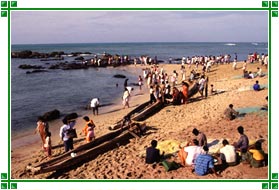 most delightful views of the surroundings.The seas are rough and waves splash furiously against the rocks here. Kanyakumari beach is a seashell collector's delight. However, some of the greater highlights of the beach are Vivekananda's Rock, a huge stone rising out of the sea, believed to be the seat of meditation of the great saint, Swami Vivekananda. One can see the statue of Vivekananda and a memorial dedicated to him here. A sacred place for the followers of Swami Vivekananda, it is surprising to see such a large number of Bengalis here in this South Indian state. The tourists love to see Sangam, the confluence point of the three seas - Bay of Bengal, Arabian Sea and Indian Ocean. It is also a lagoon where steps lead you into the waters to bathe.